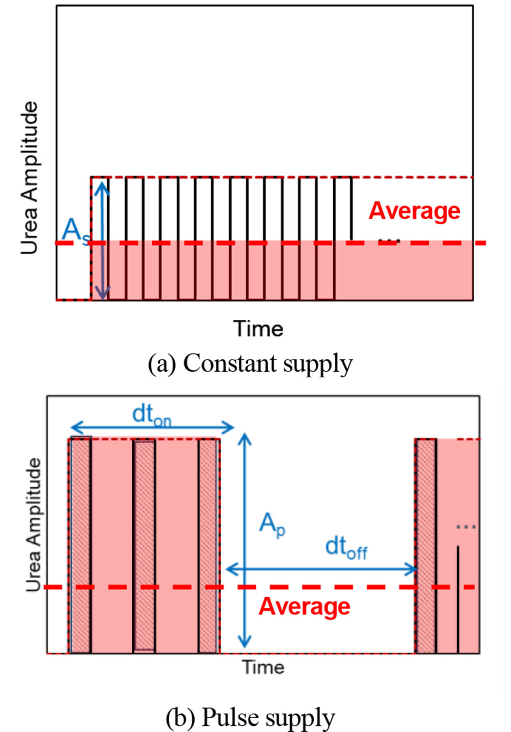 Yoshidaら(2)は、尿素SCR触媒の表面化学反応を実機エンジンの運転状態で解明するため、数値計算モデルの作成に取り組んでいる。本報告では、エンジン試験結果を元にモデルの表面化学反応速度パラメーターを変更しモデルの精度向上を検討した。尿素水噴射パターンを一定供給とパルス供給の2種類とすることで、定常だけでなく過渡での精度向上も試みた(図4)。エンジン試験により測定したガス種の濃度、入口ガス温度、尿素水量(表1)を数値モデルに用いて検討の結果、シミュレーション結果は実機結果の排出ガス挙動を良く再現できていた(図5、図6)。NO2の挙動に注目すると、ガス入口温度300℃のような高温条件では、高速SCRの浄化性能が完了し、標準SCR反応が起こりにくくなることも分かった(低温域でのSCR反応は、式1での高速SCR反応のR.1~R.4、標準SCRのR.5を示す)。