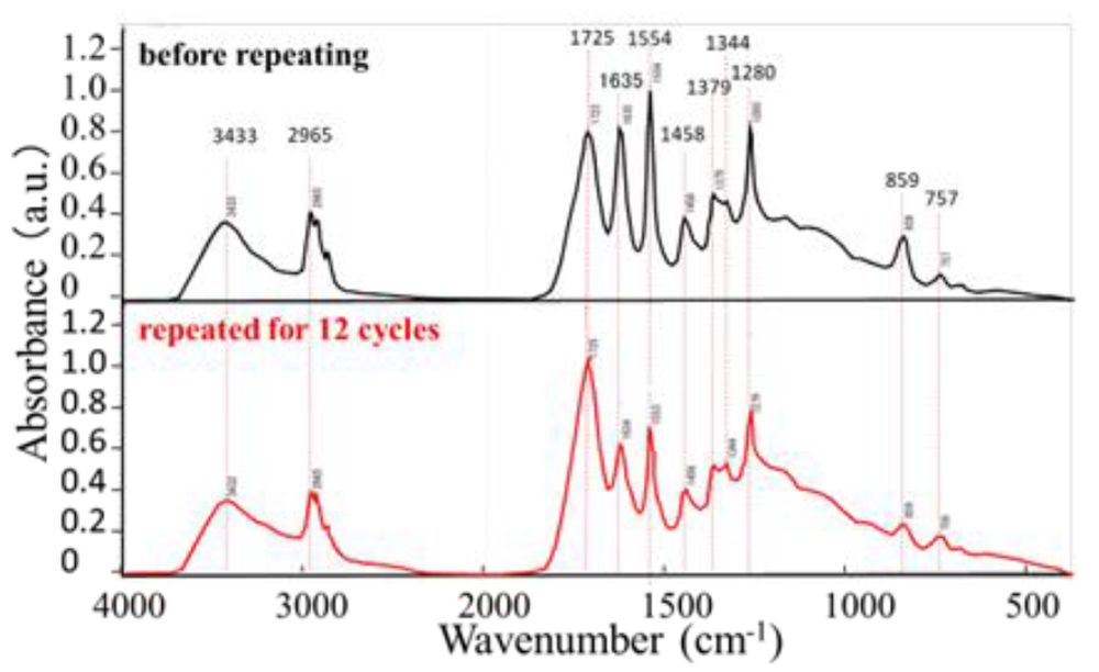 ここで形成されたデポジットは、FT-IRによる解析の結果(図3)、高温条件で形成されるデポジットがカルボン酸エステルを形成しているのに対し、カルボキシル基(1723~1725cm-1)とヒドロキシ基(3433cm-1)が別々に存在しており、分子間力(水素結合)で結びついていると推定している。そのため、高温では軟化し、低温では硬化する熱可塑性を有するデポジットとなっているとしている。