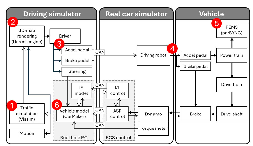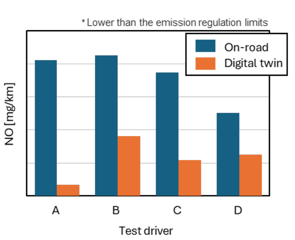 池本ら(1)は、実路での自動車エミッション評価における交通流の自由度・再現性や準備・評価時間の課題に着目し、mini-PEMSを用いた実車計測と交通流シミュレーション、ドライビングシミュレータ、リアルカーシミュレータを組み合わせた独自のデジタルツイン開発環境を構築した(図1)。この環境により、交通流シナリオを任意に作成し、運転操作を再現することで、実車同等の精度でエミッション評価が可能となった。つまり、運転特性や交通状況の影響を個別に解析できる点が本研究の大きな特徴となっている。実路とデジタルツイン環境でのNOx排出量の比較では、交通流を再現することで実路に近い傾向が得られる場合もあることが示唆された(図2)。今後は、本手法を活用し、ゼロエミッション技術開発への応用が期待される。