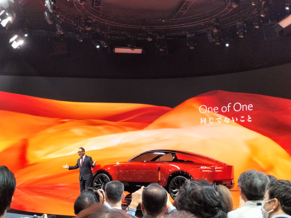 豊田章男会長があいさつ。センチュリーについて、1ブランド1トヨタの視点にとどまらない、人、過去から未来への時間軸、日本全体をなど広い視野から次の100年を見据えて熱く語りかけた。(鈴木)