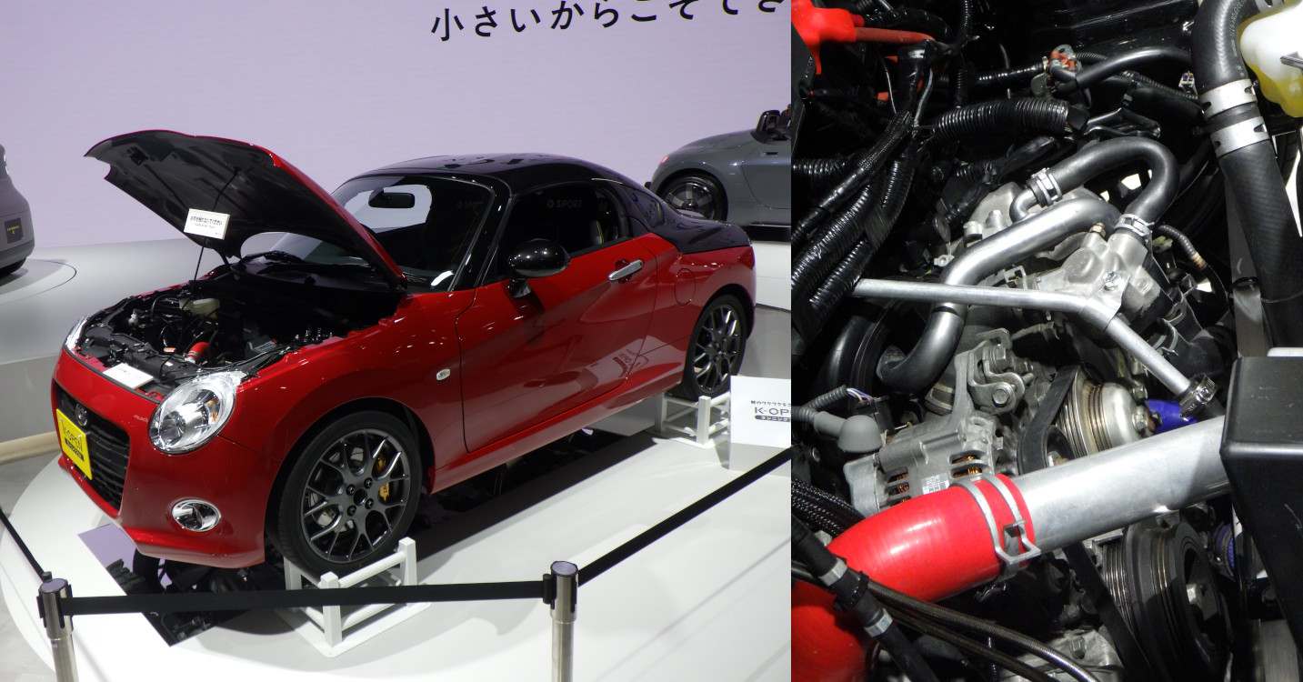 見た目は普通のコペンだがFR化。展示車はランニングプロトで実際に各種走行試験を行っているもの。(写真・左)縦置きエンジンが低い位置に配置され、ボンネットの上の方は大きく空いている。(写真・右)後輪のデフは軽トラックのものを利用しているとのこと。安く軽くしたいのが理由という。(鈴木)