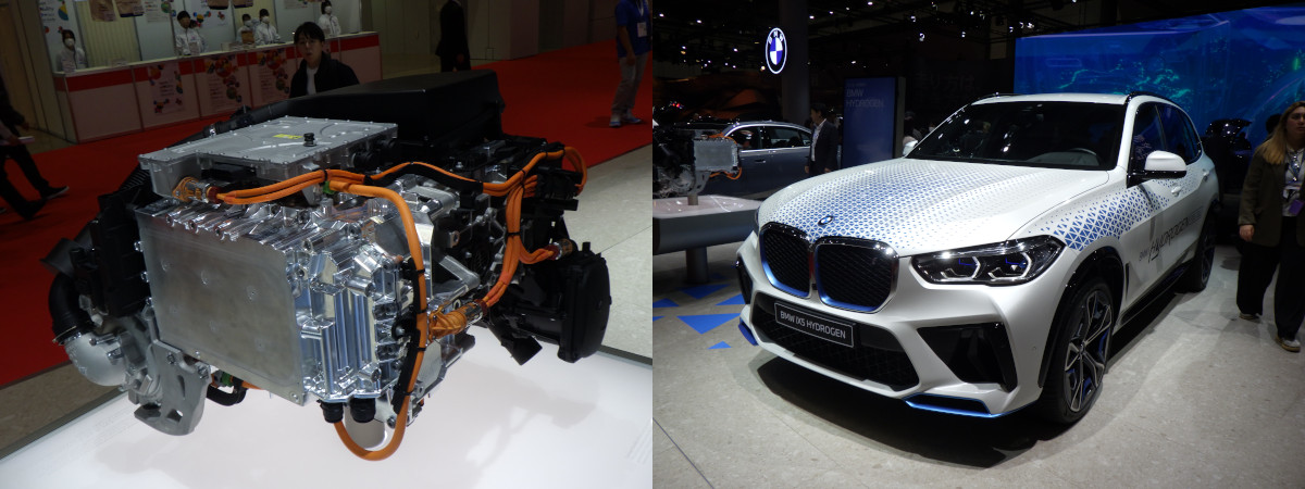 トヨタと協業している第3世代のコンセプトモデルで、インバーターなどを統合化することで25%小型化したという。(写真・左)隣に展示されているFCシステムを搭載したX5(写真・右)では、ひとつ前の第2世代のシステムを搭載し、日本も含めて走行試験を行ってデータを取得している。市場投入は第3世代のものを搭載したX5になる予定で2028年とのこと。(鈴木)