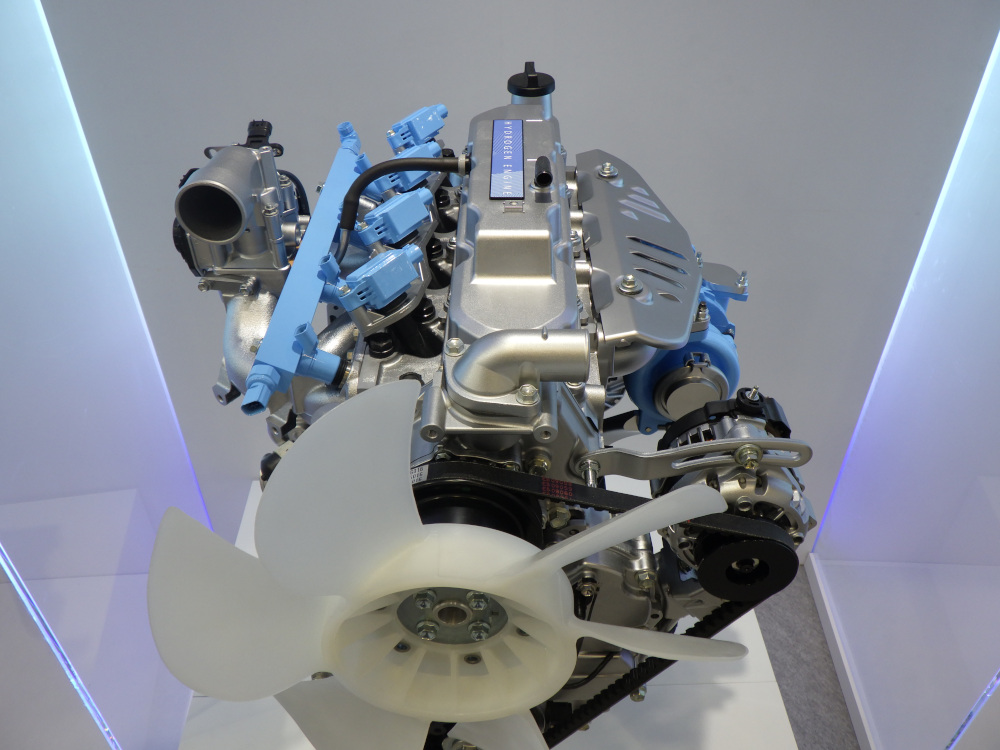 水素エンジンを展示。トヨタ自動車が開発している自動車用途は別に汎用機械や建機への搭載を企図したもの。ポート噴射で過給リーンバーンを採用。均質リーン燃焼でNOxを抑止し、シンプルな後処理装置で規制が適合できるレベルを目指す。市場投入は2030年代か。(鈴木)