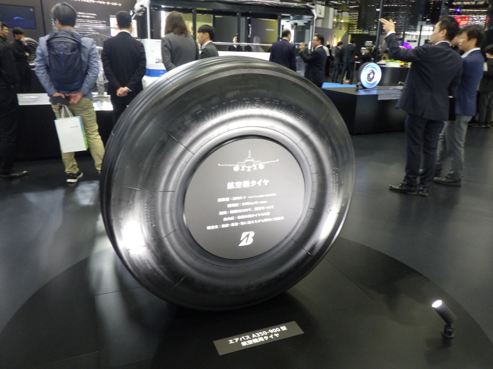 異彩を放っていたのは、旅客機エアバスA350用タイヤ。-45℃(飛行中)から250℃(着陸時最大)レベルの広い範囲で性能維持が必要。滑走路を走るタクシングが結構摩耗につながる。サステナブル性を高めるため、リトレッドを含めた製造から廃棄の低炭素化や軽量化がポイントという。(鈴木)