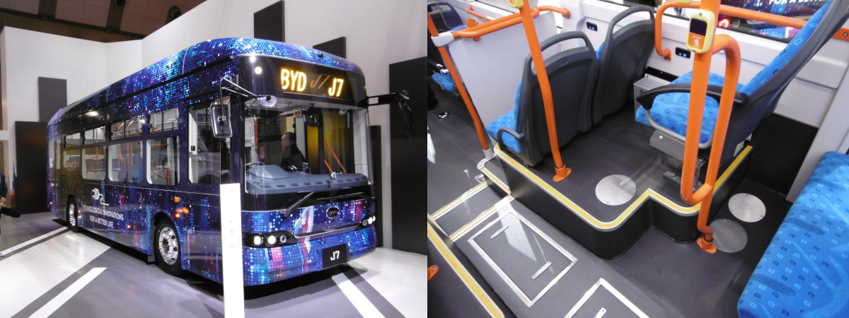日本固有ともいうべき全長9m、幅2.3mの中型EVバス。(写真・左)日本市場向けというだけあって車内は国産車から大きな違和感はない。気になったのは、後部2列シートの中に1か所だけ1列のものがあったこと。そこは後輪上でホイールインモーター点検のためのアクセス口があった。(写真・右)(鈴木)