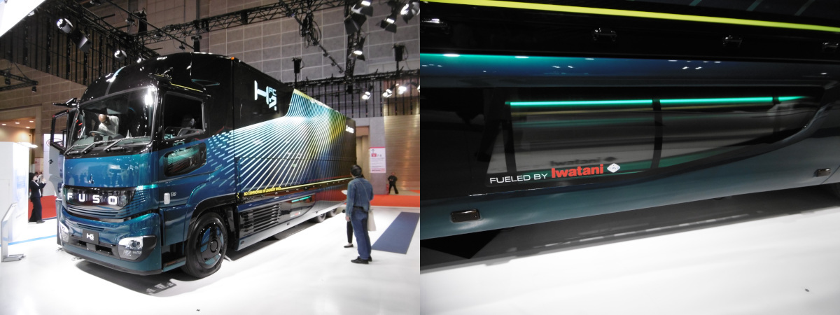 いくつか展示されている水素燃料車で唯一液体水素を燃料としたもの。(写真・左)インフラも含めた液体水素供給系は岩谷産業が協業している。(写真・右)液体水素は加圧して供給(sLH2)することで再液化を可能とし、シンプルかつ無駄をなくしているという。また、70MPaの圧縮水素比で約1.5倍のエネルギー密度を得られたことで、他の水素燃料車ではキャブ後ろまで燃料タンクを搭載しているのに対し本車のみは荷台下にすべてタンクを収納してディーゼル車並みの航続性能を確保したという。(鈴木)