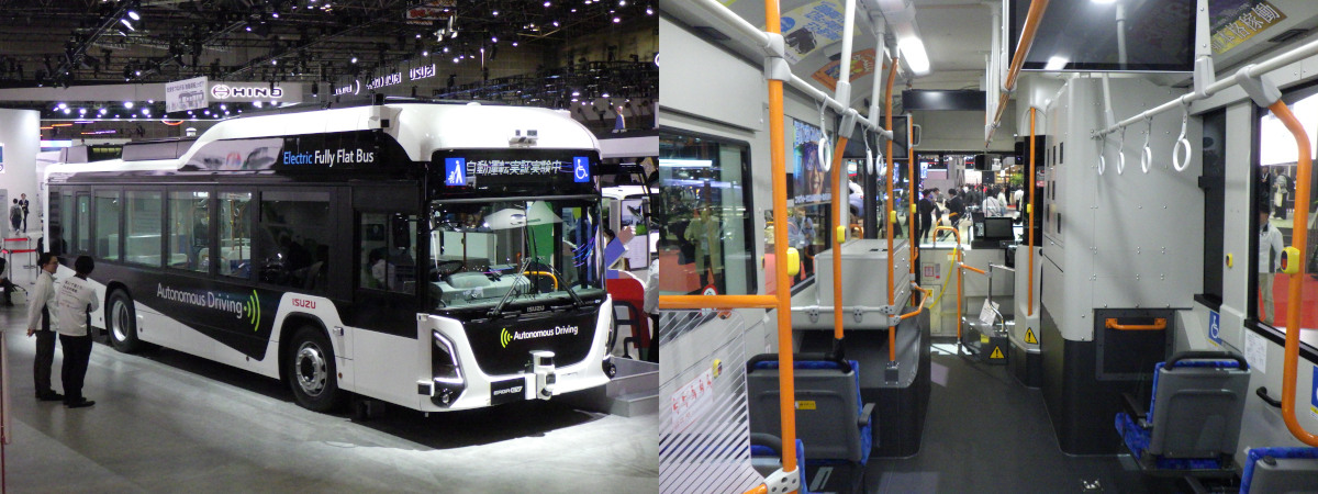 すでに商品化したEVバス(写真・左)だが、近く神奈川県内で自動運転の実証走行をするという。前後左右に取り付けられたカメラやLiDARセンサーに注目。車内に巨大なユニットが設置されていたが、それが自動運転の制御を行うための機器とのこと。(写真・右)2028年にレベル4を目指すという。(鈴木)