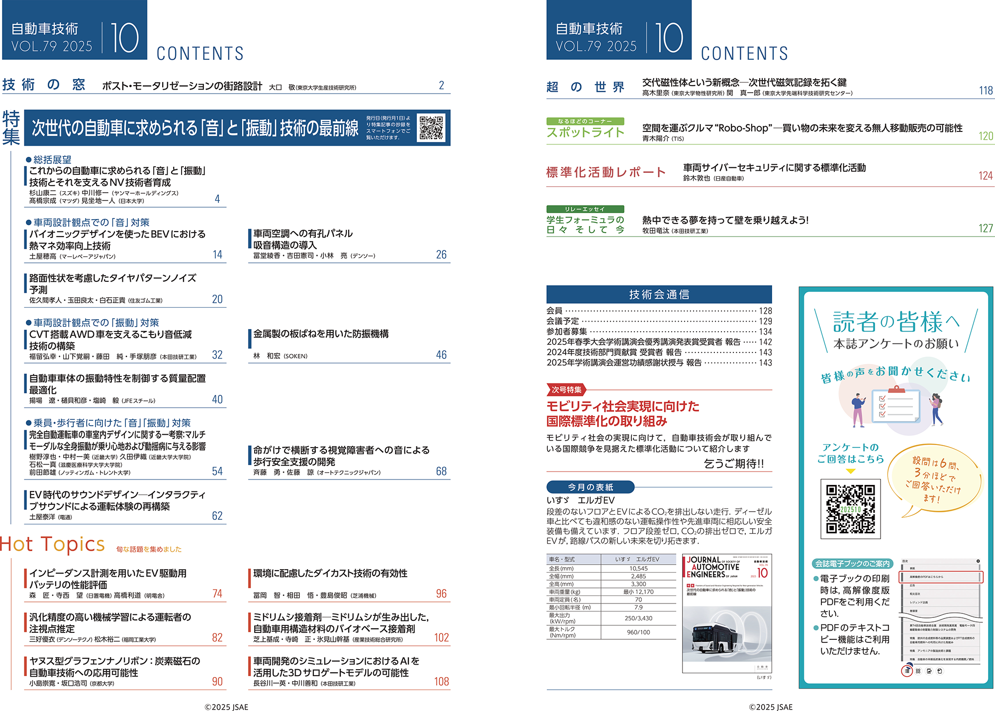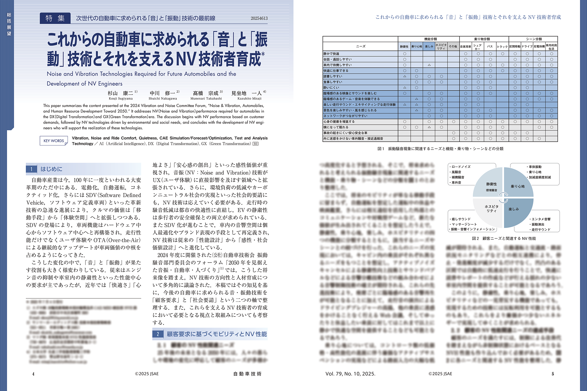 「音」と「振動」は人間の感覚に直接作用し、現代に至るまで快適さと不快さの両面を生み出してきました。自動車においても、静粛性が評価される一方で「静かすぎて歩行者に気づかれない」といった課題への対応が求められてきました。本特集号では、これらの課題を鑑みて、次世代の自動車に向けた最新の「音」と「振動」にまつわる幅広い研究をご紹介しました。是非ご覧ください。
