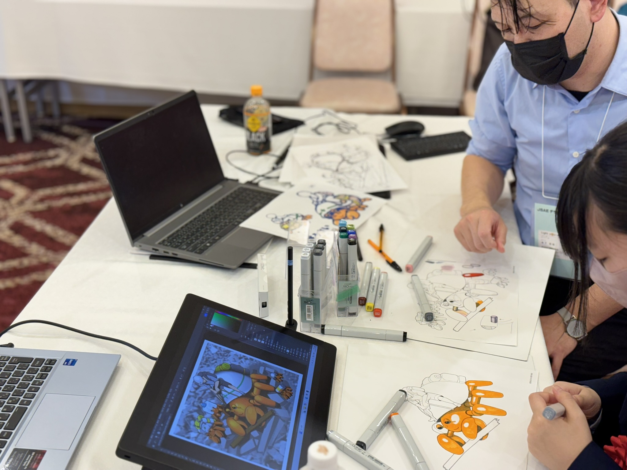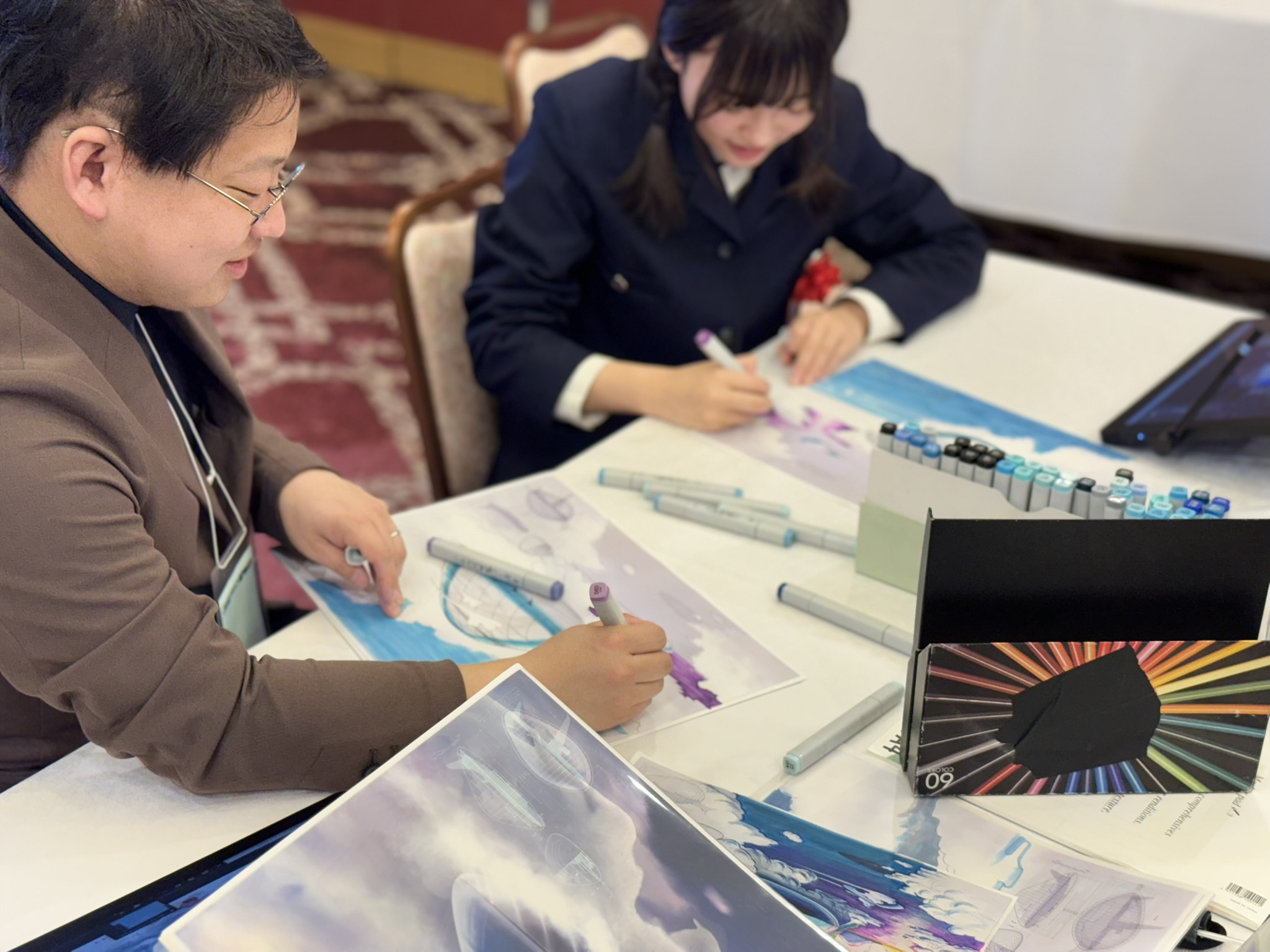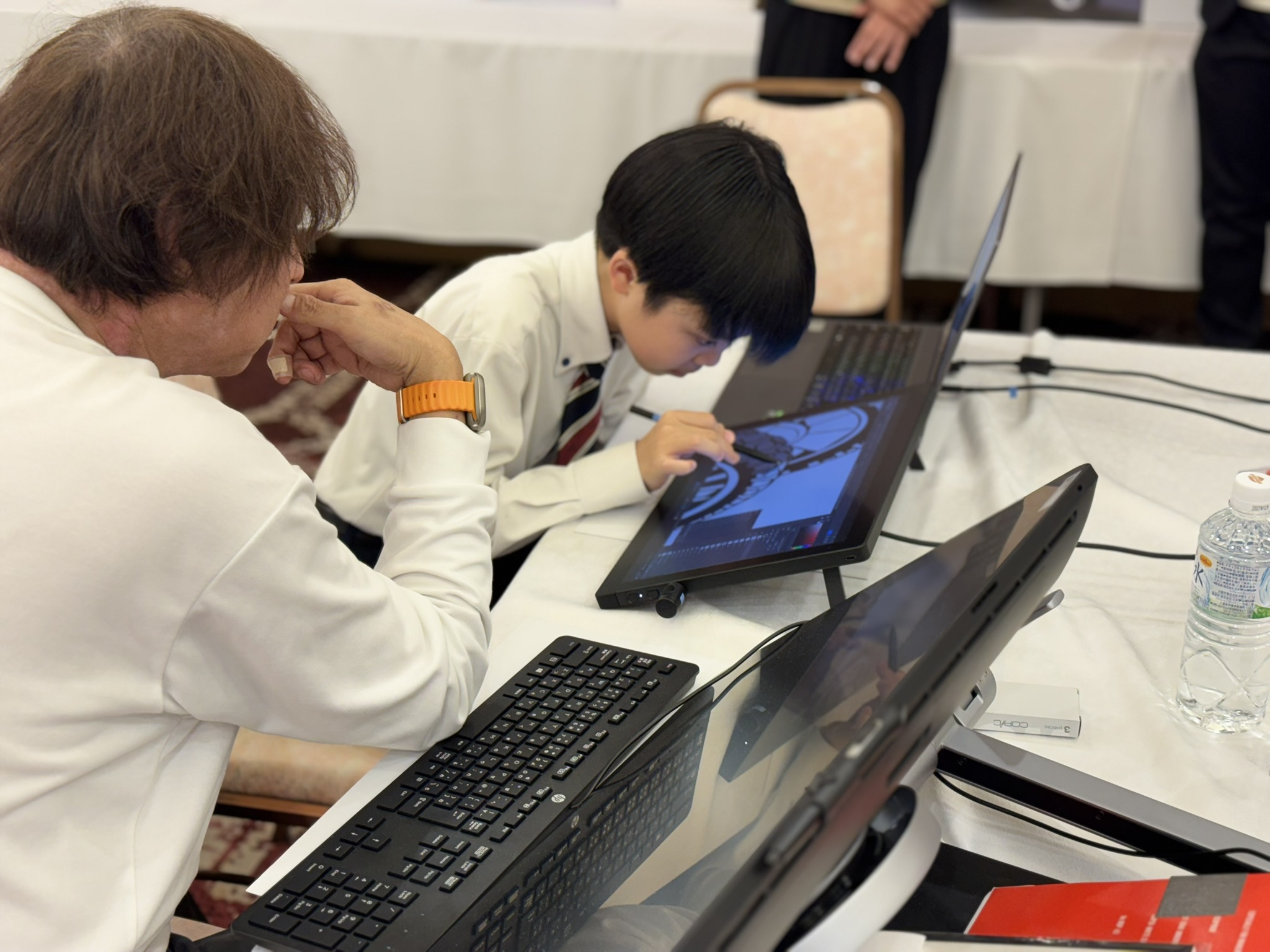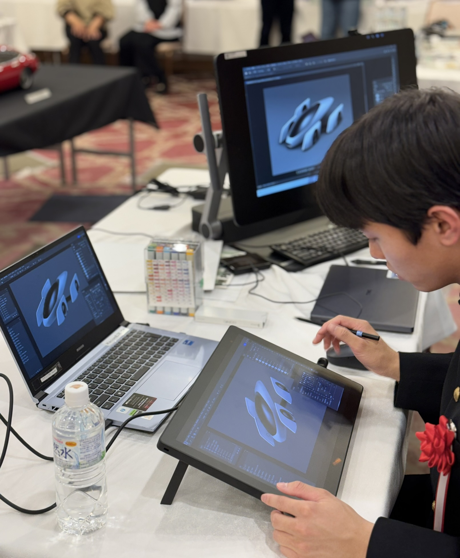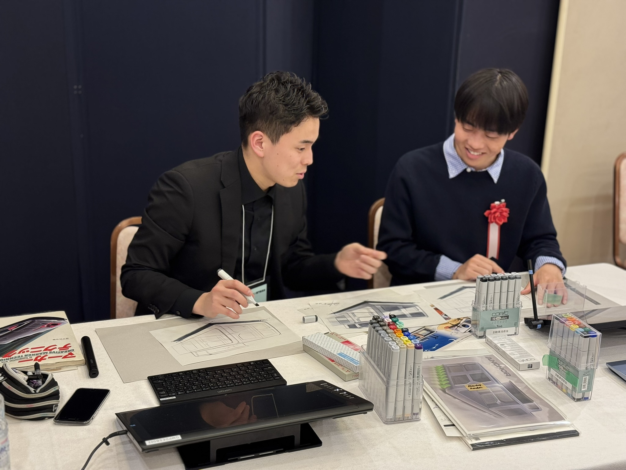 表彰式後に、本コンテストの最大の特色でもある、プロのモビリティデザイナーから受賞者にマンツーマンでスケッチ指導が行われました。受賞者からは、「憧れのデザイナーと話せて嬉しかった」・「新しい概念を教えてもらい絵が上達できた」・「線の書き方の特徴を褒めてもらい嬉しかった」・「自分も未来を形にする一員として、デザイナーを志したい。」といったコメントをいただいています。